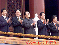 黨和國家領導人江澤民、李鵬、朱镕基、李瑞環、胡錦濤等在天安門城樓上出席首都各界人民慶祝中華人民共和國成立50周年大會。作者:趙偉