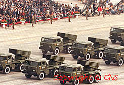 國慶首都閱兵中的輪式122式自行火箭炮方隊。(本社記者人民大會堂制高點傳真)作者:任晨鳴