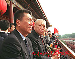 香港特區首任行政長官董建華(左二)、澳門候任行政長官何厚鏵(左一),十月一日在天安門城樓上觀禮國慶大典。(本社記者天安門城樓數碼傳真)作者:李剛