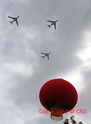 參加國慶閱兵式的轟炸機梯隊飛過北京天安門廣場上空。作者:錢興強