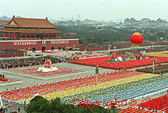 北京參加國慶慶典的群眾游行方陣和背景組字隊伍在天安門廣場上形成鮮艷的色塊效果,把節日的廣場點綴得分外美麗。作者:任晨鳴