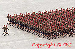 由白求恩軍醫(yī)學院學員組成的女兵方隊,十月一日邁著整齊的步伐經(jīng)過天安門城樓。該校曾經(jīng)組建中國閱兵史上的第一支女兵方隊參加國慶三十五周年的首都閱兵慶典。作者:滿會喬