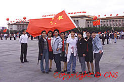 十月一日下午,參加國慶聯歡晚會的學生們在晚會開始前紛紛在天安門廣場留影。作者:舒元成