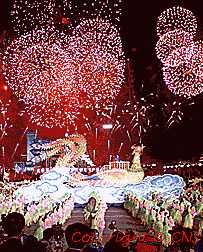 在北京天安門廣場舉行的首都國慶聯歡晚會上,鳳凰彩車與繽紛的禮花爭奇斗艷。作者:宗金柱