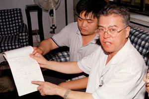 8月3日,吉林省人民醫院發現李洪志曾在該醫院做過闌尾炎手術的住院病歷。李洪志在1984年7月8日早晨突 發急性化膿性闌尾炎,住進吉林省人民醫院普通外科,發燒38.9度,于當天下午實施闌尾切除手術,住院10天。由于當 時醫生筆誤,錯將李洪志寫作“李宏志”,根據病歷上的患者年齡、工作單位、家庭住址及家屬(李妻)的手術簽字,可確定 患者即李洪志。圖為當時為李洪志做手術的主治醫師、現吉林省人民醫院副院長李英杰(右)講述當年為李洪志確診手術的情 景。張寶江攝(新華社稿 傳真照片)