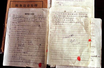 7月29日,長春市地方稅務局稽查分局查到李洪志偷稅的證據。1992年到1994年3年中,李洪志在傳授“ 法輪功”的經營行為中,偷稅8655.9元。這是稽查分局1994年11月24日的一份筆錄,上有李洪志供認偷稅事實 的親筆簽名及手印。 新華社記者徐家軍攝(傳真照片)