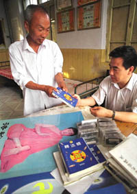 收看中央決定取締“法輪功”和李洪志其人其事的報道后,長春市農安縣的部分“法輪功”練功骨干幡然悔悟。他們 紛紛向公安部門交出自己的“法輪功”書籍和李洪志畫像,并寫材料揭發李洪志對自己的欺騙,表示向黨組織靠攏,堅決與“ 法輪功”劃清界線。這是7月23日,農安縣合隆鎮“法輪功”輔導站負責人、65歲的小學教師段寶臣(左)交出自己的“ 法輪功”書籍,并保證堅決脫離“法輪功”。 新華社記者蔣林攝(傳真照片)