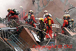 消防人員日夜不眠在臺北市八德路倒塌的東星大樓瓦礫堆中搶救受難者。中新社臺北傳真