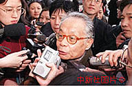 出席全國政協九屆三次會議的科技界全國政協委員何祚庥三日步入開幕會場時,回答記者的提問。作者:李剛