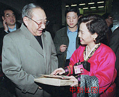 中共中央政治局常委、國務院副總理李嵐清四日參加全國政協(xié)九屆三次會議文藝界聯(lián)組會時,與政協(xié)委員、吉林省延邊歌舞團編導李承淑親切交談。作者:李剛