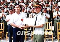 七月二十七日,珠海市委市政府慰問團到駐澳門部隊珠海基地慰問,珠海市副市長郭開華(左)代表珠海市向駐澳門部隊珠海基地贈送慰問金。中新社圖 石頭 攝