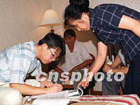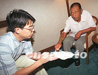 日本律師森田太三(左)五日來京為當年中國勞工劉清嶺(右)在日本訴訟的《強制勞動損害賠償請求訴訟案》取證。中新社記者 史利 攝