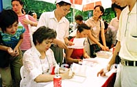應(yīng)邀來福州的香港著名企業(yè)家作家梁鳳儀今天上午冒著酷熱天氣,為福州讀者簽名售書。中新社記者 鄭祚聲 攝