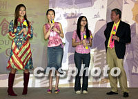 香港著名美食家蔡瀾13日在香港出席《廣州恒寶華庭蔡瀾美食城》記者會。影視藝人李珊珊、任葆琳、王秀琳(左一起)等應邀出席助威。中新社圖 鄧慶樂 攝