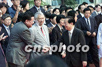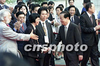 國務院副總理錢其琛十六日親赴南京紫金山下的國際會議中心,看望出席首屆世界華文傳媒論壇的代表,與香港代表鳳凰衛視主席劉長樂等親切握手。中新社記者 王瑤 攝