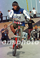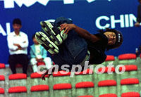 2001年亞洲極限運(yùn)動(dòng)精英賽4日在浙江湖州市拉開(kāi)帷幕,來(lái)日本、韓國(guó)、馬來(lái)西亞及臺(tái)灣、香港的近百名選手將參加攀巖、滾軸、小輪車(chē)等項(xiàng)目的比賽,圖為中國(guó)廣州選手鐘騰飛在花式小輪車(chē)比賽中。中新社記者 趙振清 攝