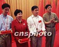 海南文昌市18日授予孫穗芳(左二)榮譽市民稱號,并向孫女士贈送金鑰匙一把,以表彰孫穗芳對文昌宋氏祖居的關切和支持。孫穗芳的兩個兒子王祖榮和王祖耀同時被授予榮譽市民。中新社圖 王辛莉 攝