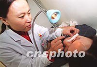 臺灣學生日前在北京中醫藥大學第一臨床醫學院針灸科臨床實習。北京中醫藥大學一九九七年至今共招收三百零二名來自香港、澳門、臺灣的本科生、研究生,經過五年的學習畢業后,將分別獲得醫學學士、醫學碩士、醫學博士等學位。中新社記者 張勤 攝