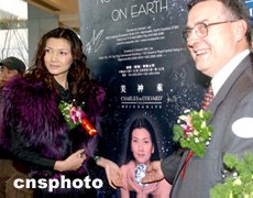 美國著名的詩思有限公司日前在北京舉辦新聞發布會,宣布委任中國名模姜培琳小姐(左一)為世界著名“美神萊”寶石品牌2002國際代言人。該品牌一直以獨立自主的現代女性為國際形象,波姬小絲、米亞漢姆以及喬娜柯西等都作為該品牌代言人。圖為美國詩思有限公司總裁郭偉思先生(右)從美國到京出席發布會。中新社記者 錢興強 攝