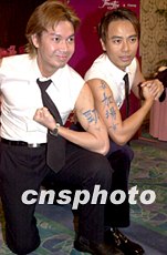 歌星李克勤27日在香港舉行《位元堂李克勤情情塔塔演唱會》記者會,是次演唱會檔期為02年2月13至18日,正是農歷新年及情人節,觀眾可和克勤溫馨卿浪漫地共渡佳節。圖為記者會上李克勤(右)與司儀梁榮忠以搞笑形式,增添氣氛。中新社傳真 鄧慶樂 攝