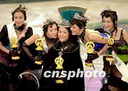二零零二年度國際華裔小姐總決賽二十七日晚在廣州舉行,溫哥華小姐周雪獲得冠軍,多倫多小姐白穎茵(左二)獲得亞軍,吉隆坡小姐符愫娛(右二)獲得季軍。中新社記者 梁永強 攝
