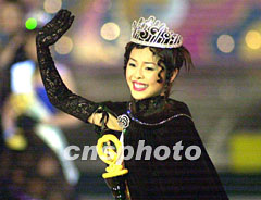 二零零二年度國際華裔小姐總決賽二十七日晚在廣州舉行,獲得冠軍的溫哥華小姐周雪向觀眾揮手致意。中新社圖 梁永強 攝