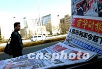 一位市民二十一日經(jīng)過(guò)中國(guó)人民銀行北京總部前的一個(gè)報(bào)攤。為了克服世界經(jīng)濟(jì)增長(zhǎng)持續(xù)放緩對(duì)中國(guó)經(jīng)濟(jì)發(fā)展帶來(lái)的不利影響,保持中國(guó)國(guó)民經(jīng)濟(jì)持續(xù)、快速、健康發(fā)展,中國(guó)人民銀行今起再次下調(diào)人民幣存、貸款利率。中新社圖 武仲林 攝