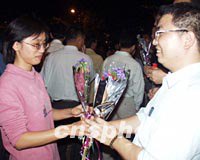 元宵佳節,海南省瓊山市舉辦民間元宵換花節,近十萬市民參與了當晚的賞燈換花活動。圖為一對男女青年當街相互換花,有情人以此連理。中新社圖 王辛莉 攝