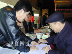 全國政協委員張虎生(右)1日下午向會務組報到。余瑞冬攝