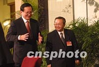 中國外交部長唐家璇與九屆全國人大五次會議新聞發言人曾建徽,六日走出人民大會堂記者招待會現場。唐家璇在會上說,中國入世有利于香港繼續維持包括國際金融中心在內的三個國際中心地位。中新社記者 劉殊瑾 攝