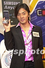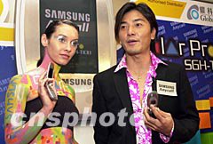 歌影視紅星鄭伊健12日在香港應邀出席三星Anycall SGH-T108彩色顯示手機發布會,鄭伊健繼續出任三星Anycall新手機代言人,并向媒體展示新手機。中新社圖 鄧慶樂 攝