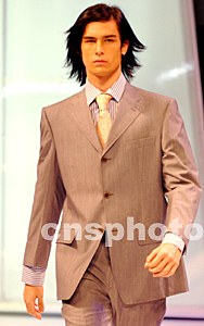 FERRAGAMO時裝表演展出男裝系列.國際名牌SALVATORE FERRAGAMO春夏季之時裝表演19日在香港舉行,今季展出男裝系列,以傳統三粒紐扣款式設計,簡潔而硬朗。中新社傳真 洪少葵 攝
