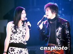 二十二日晚,蘇有朋在滬舉辦了其入行以來首場個人演唱會,在演唱會上與內地女主持舒高深情對唱一曲“一路順風”。圖為蘇有朋與舒高在演唱會上演唱。中新社圖 彥俊 攝