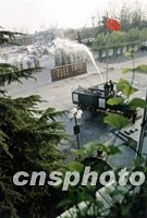 北京大興武警后勤基地消防隊,三月結合消防演練任務,派消防車一邊給大樹澆水,一邊訓練消防動作,一舉兩得。中新社圖 曹文 攝