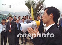 2002粵臺經濟貿易技術交流會期間,珠海臨港工業區在三十日舉行了十三個新建項目的動工儀式,總投資額約二點二億美元,珠海臨港工業區成為珠海最具有綜合競爭力的經濟功能區。圖為珠海市南水鎮地方官員客串導游向來賓介紹工業區的情況。中新社圖 石頭 攝