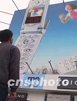 近日,在北京王府井的街頭立起了一塊用手機(jī)廣告裝飾的時間牌,它可以顯示時間和溫度,給行人帶來方便。手機(jī)廠商為了搶占手機(jī)市場可謂煞費(fèi)苦心。中新社記者 杜洋 攝