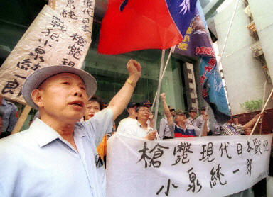 中新網香港4月24日消息:臺北訊,一批臺灣民眾周二上街示威,高呼“打倒日本軍國主義”的口號,抗議日本首相小泉純一郎參拜靖國神社。