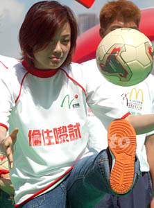 香港歌星容祖兒,5月4日參加在青衣運動場舉行的“香港青少年迎接世界杯活動”竭盡全力表演足球基本功。任晨鳴攝