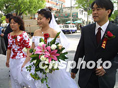 五一假期,一對身穿禮服的新人舍棄豪華婚車,在家人陪同下從洋橋家中走到西單舉行婚禮,在假日婚潮中創造了一項“走婚”紀錄。中新社記者 鄭萍萍 攝