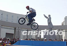 極限輪滑選手七日在吉林市世紀廣場的毛澤東塑像前表演。中新社圖 寧秀英 攝