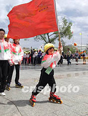 五月在吉林舉行的第十七屆中國速度輪滑錦標賽中,陜西選手周承歧年僅六歲,高舉旗幟首當其沖。中新社圖 韓丹 攝