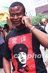為了給中國慈善事業募集資金,各國駐華使館在五月的京城舉行了一場充滿異域風情的義賣。一非洲青年身穿印有“雷鋒”頭像的T恤來到義賣現場。已故的“雷鋒”,生前是善于為民服務的一名普通士兵,至今廣受中國人喜愛。章永哲 攝
