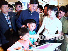 19日,聯(lián)想集團總裁楊元慶(中)在北京世紀壇科技活動周中與前來參觀的小朋友一同體驗未來的數(shù)字家庭E-home。中新社記者 杜洋 攝