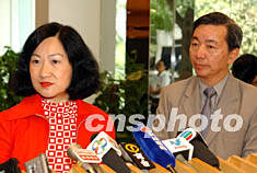 五月二十五日,香港保安局局長葉劉淑儀和撲滅罪行委員會委員蔡元云向新聞界表示,一年來,香港治安穩定,金鋪、表行劫案下降百分之五十。中新社記者 潘索菲 攝