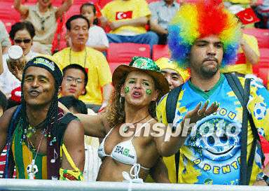 6月3日下午,韓日世界杯C組巴西與土耳其隊的比賽正在韓國蔚山文竹體育場進(jìn)行。圖為看臺上身穿比基尼的女球迷。