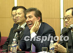永利度假村(澳門)股份有限公司二十四日與澳門特區政府簽署娛樂場幸運博彩經營批給合同簽字儀式后,永利負責人史提芬·永利在記者招待會上談笑風生。李剛 攝