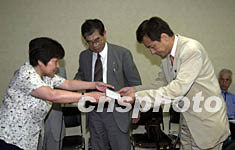 花岡事件受難者聯誼會2日在日本國會發表《致日本內閣函》,要求日本政府正視強擄、奴役中國戰俘勞工的歷史,承擔政治、法律、道義上的責任,公開、正式地向中國人民謝罪。圖為受難者家屬代表王紅向日本國會議員提交函件。中新社記者 陶光雄 攝