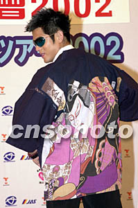 歌星郭富城3日在香港舉行“郭富城日本演唱會2002”記者會,遠道從日本來港的歌迷向偶像送上日本和服,他并即場穿上。郭富城日本演唱會將在八月份于大阪、東京、橫濱舉行三場。鄧慶樂 攝