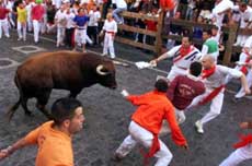 7月6日,一年一度的奔牛節在西班牙潘普洛納市拉開帷幕;顒赢斕,就有數人在斗牛狂奔過程中被牛角刮傷。據稱,今年的奔牛節是近年來最危險的一次。圖為奔跑的人們引領著瘋狂的公牛。(春風)