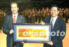 中國人民解放軍軍樂團八日晚在澳門綜藝館舉行盛大演出,澳門娛樂旅游有限公司董事總經理何鴻燊向軍樂團贈送澳門全景畫框。李剛 攝
